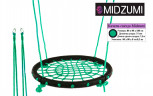Качели-гнездо Midzumi выполнены из металлической рамы диаметром 60 сантиметров, с дополнительной защитной оплеткой ее бортиков, обтянутых прочным синтетическим канатом толщиной 10 мм выдерживающим нагрузку 100 кг. Плетеное синтетическое сидение качелей удобное и практичное, не собирает грязь и воду, при сильных загрязнениях его можно протереть.