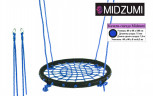Качели-гнездо Midzumi выполнены из металлической рамы диаметром 60 сантиметров, с дополнительной защитной оплеткой ее бортиков, обтянутых прочным синтетическим канатом толщиной 10 мм выдерживающим нагрузку 100 кг. Плетеное синтетическое сидение качелей удобное и практичное, не собирает грязь и воду, при сильных загрязнениях его можно протереть.